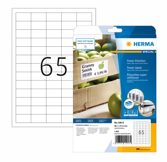 The HERMA 10913 A4 labels are an excellent choice for reliable and durable labeling solutions. With twice the adhesive strength of conventional paper labels, they are ideal for moist, warm, cold, rough, or dusty surfaces. Perfect for labeling products, documents, and objects in inventories, safety messages, warning messages, wrap-around labels, test badges, or seal labels. Designed for indoor use, these labels are environmentally friendly, made from high-quality, chlorine-free bleached special paper, and FSC™ Mix Credit certified. They are 100% recyclable and can be disposed of as waste paper. Excellent printing results on all laser printers, inkjet printers, copiers, color laser printers, and color copiers. Easy to handle with an all-round protective edge and optimal flatness. Free software solutions available at: www.herma.com.