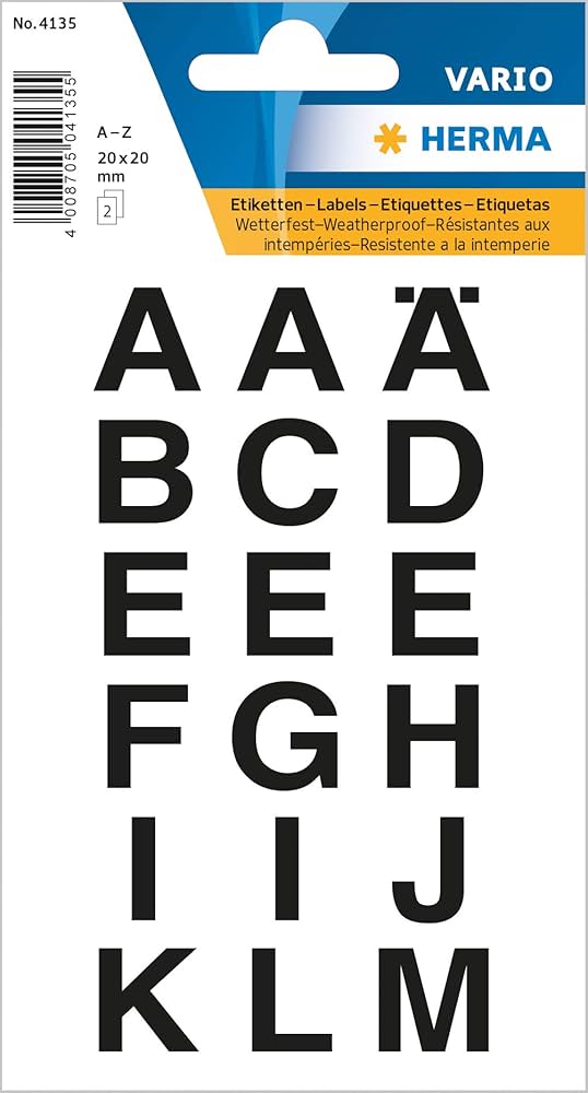 HERMA 4135 A4-tarrat ovat itseliimautuvia tarrakirjaimia, jotka on suunniteltu monipuoliseen merkintään. Mustat kirjaimet ovat kooltaan 20 x 20 mm ja ne on valmistettu läpinäkyvästä, säänkestävästä kalvosta, mikä tekee niistä sopivia sekä sisä- että ulkokäyttöön. Setti sisältää kaksi A4-arkkia, joissa kummassakin on 18 kirjainta (yhteensä 36 kirjainta A-Z). Arkin mitat ovat 84 x 120 mm. Tarrat tarjoavat pysyvän tartunnan ja ne on helppo kiinnittää eri pintoihin.