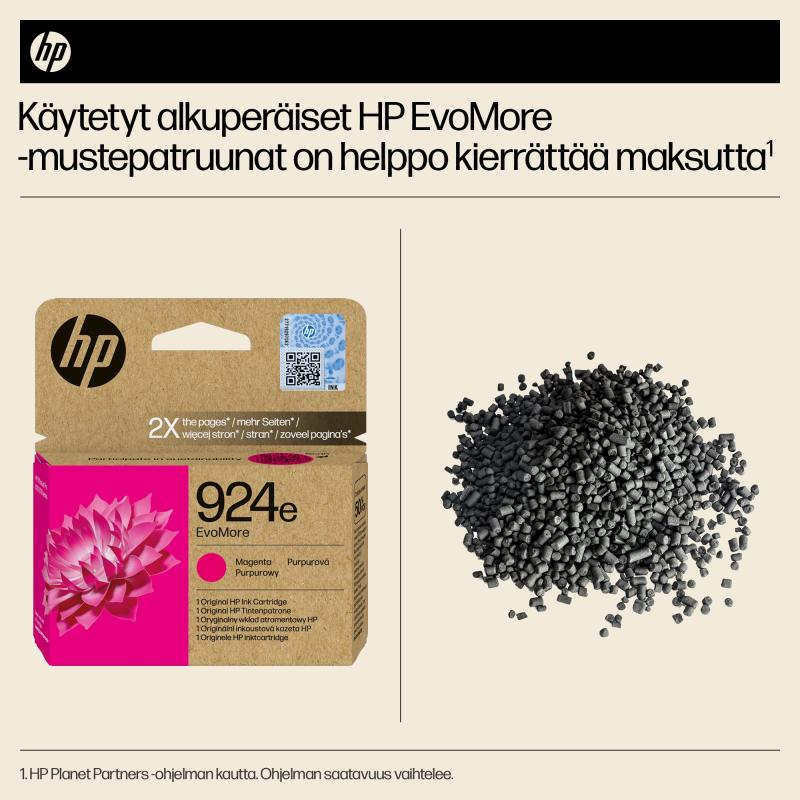 - Onko tuote ympäristöystävällinen ja turvallinen? Kyllä, HP 924e mustepatruuna on suunniteltu pienentämään hiilijalanjälkeä ja se on helposti kierrätettävissä HP Planet Partners -ohjelman kautta.