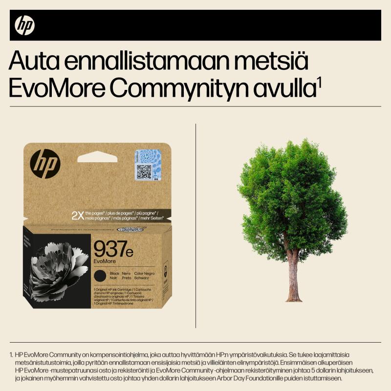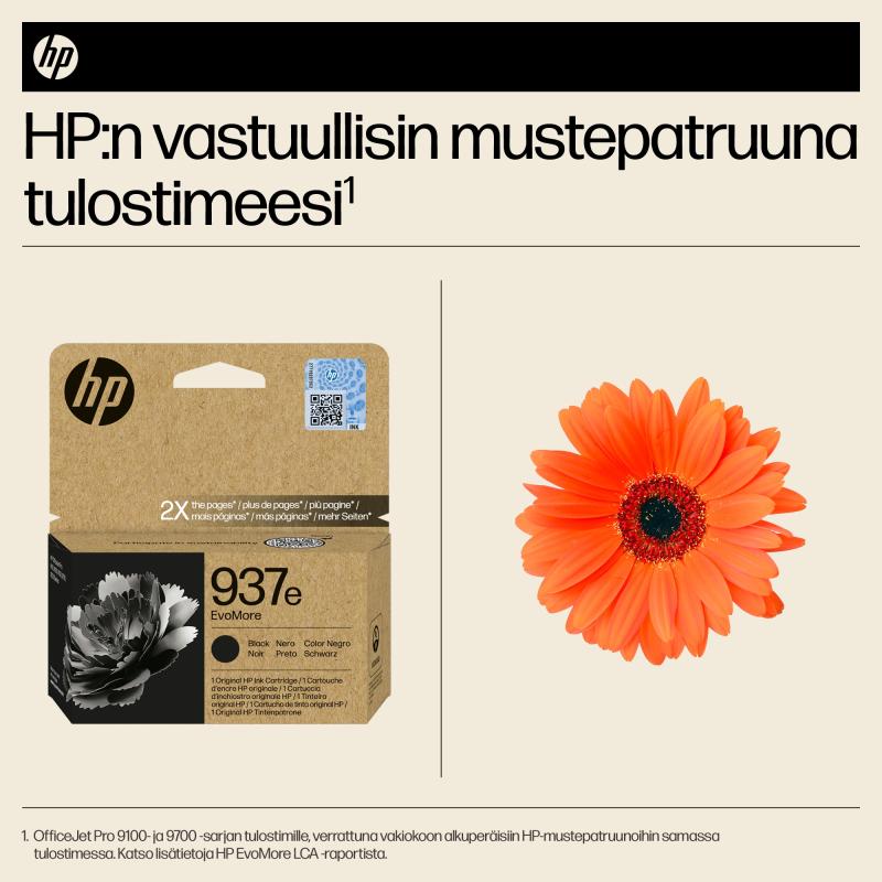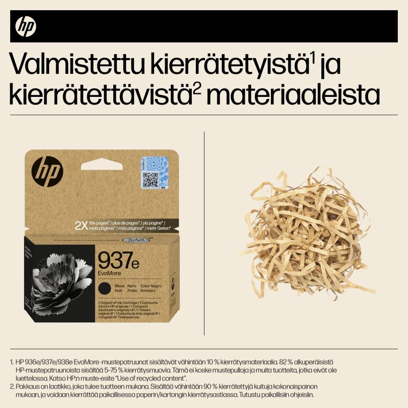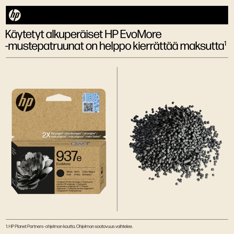 HP 937e alkuperäinen musta EvoMore -mustepatruuna on suunniteltu suurivolyymiseen ja ympäristötietoiseen yritystulostukseen. Se tuottaa noin 2,500 sivua, mikä on kaksinkertainen määrä tavallisiin patruunoihin verrattuna, ja sen hiilijalanjälki on pienempi. Mustepatruuna on yhteensopiva useiden HP OfficeJet Pro -tulostimien kanssa ja tarjoaa korkealaatuista tulostusjälkeä. Pakkaus on 100% kierrätettävä, ja tuote tukee kestävää kehitystä. HP 937e -patruunan voi ostaa helposti Mininova.fi-verkkokaupasta.