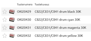 - OKI:n 44844406-rumpusarja on suunniteltu erityisesti OKI C310 -sarjan tulostimille, tarjoten laadukkaita ja kestäviä tulosteita. Sarja sisältää seuraavat värit:
