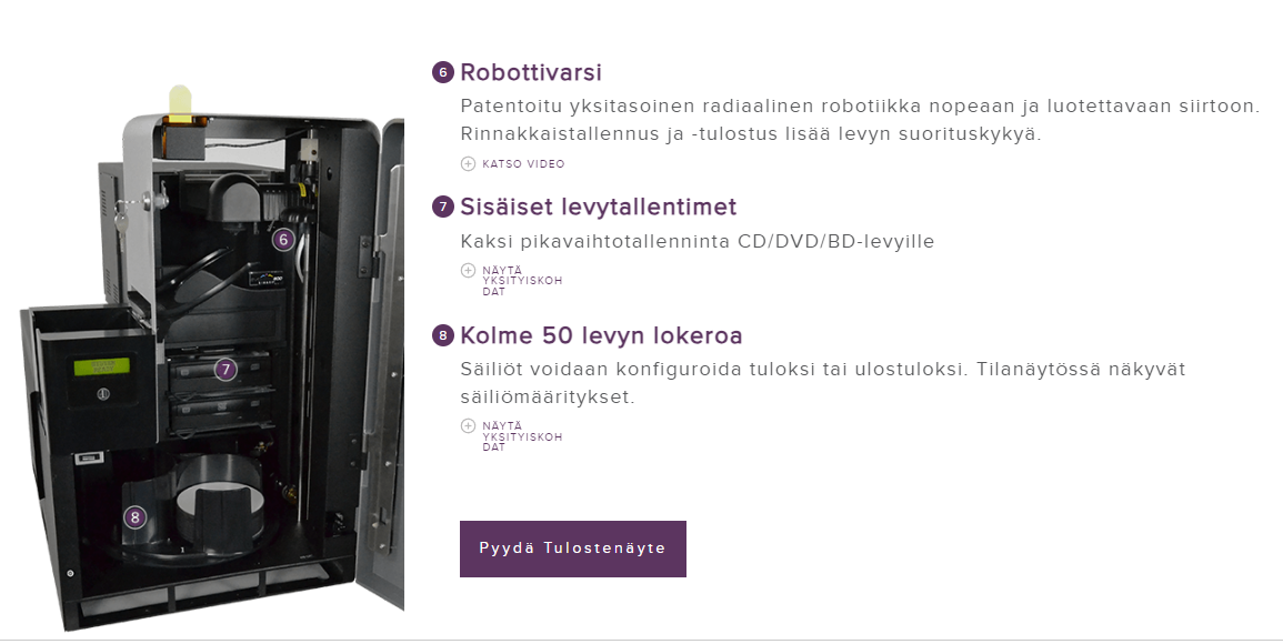 Kolmikotelossa oleva karuselli käsittelee jopa 150 levyä, joko yhden tyyppisiä levyjä keskeytymätöntä tuotantoa varten tai enintään kolme tyyppisiä levyjä tuottavan joustavuuden saavuttamiseksi. Levyn ulostulo voidaan konfiguroida ulkoiseen laatikkoon tai johonkin sisäiseen lokeroon lukittavan oven takana.