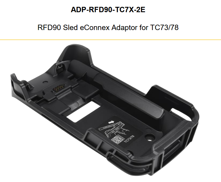 The Zebra ADP-RFD90-TC7X-2E is an eConnex™ adaptor designed to provide a direct wired connection between the Zebra RFD90 Ultra-Rugged UHF RFID Sled and the TC73 and TC78 mobile computers. This adaptor ensures seamless integration, allowing secure mounting of the TC73 or TC78 atop the RFD90 sled, enhancing operational efficiency in environments requiring robust RFID capabilities.